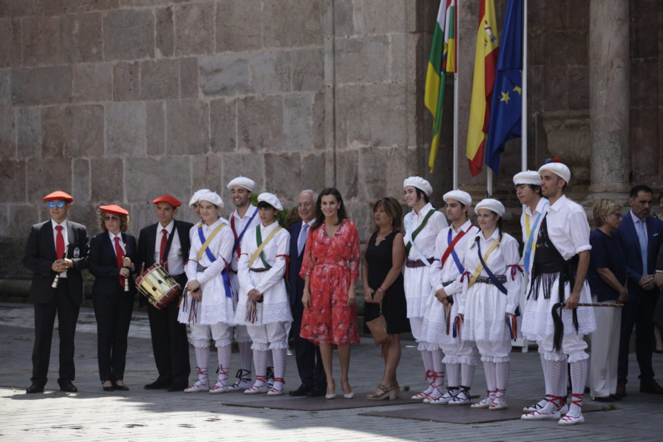 La misma llegó puntual a las 11.30 horas de este viernes con unos stilettos de vértigo al empedrado patio del bonito Monasterio y tras asistir al cierre del seminario, pudo presenciar unos bailes populares riojanos interpretados por el Grupo de Danzas de San Millán, con música en directo con los gaiteros. Cuando concluyeron, la reina se acercó para hablar con ellos.