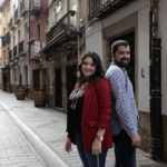 Álvaro Marín y Andrea Ruiz son este año las ‘estrellas’ de San Mateo, los vendimiadores, los elegidos para representar a los logroñeses durante las fiestas. Si la calle Portales fuera el paseo de la fama hollywoodiense tendrían que dejar este año su propio sello, que les recuerde en los años venideros lo que en 2018 fueron. Y en eso hemos estado. En retratar a estos dos jóvenes logroñeses en el corazón del casco antiguo, donde la fiesta matea toma todo su impulso cada año. Quedamos en el Museo de La Rioja. Pero decidimos hablar de San Mateo en una terraza de la calle Portales. Los logroñeses pasean tranquilos, ajenos al barullo y estrés que conllevan los preparativos de las fiestas. Café con leche y hielos pide la vendimiadora. El vendimiador opta por agua con gas. Hablamos de todo un poco, pero San Mateo acaba acaparando la conversación. Es obligado. No tienen nervios, o eso dicen, pero sí mucha ilusión, afirmación que confirman sus miradas.